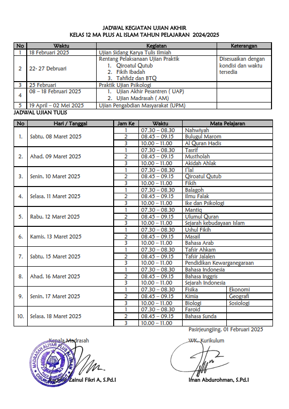 Rencananya kegiatan ujian akhir ini akan dilaksanakan mulai 18 februari hingga bulan mei 2025 dengan jadwal sebagai berikut: